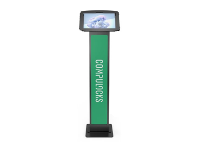 Our BrandMe floor stand allows you to utilize a panel for branding, call to action or custom design to bring attention to your interactive display or kiosk. The tilting mount allows the iPad enclosure to be set in either portrait or landscape mode and the stand base offers additional security features, securing the power source and bolting the unit to the floor.